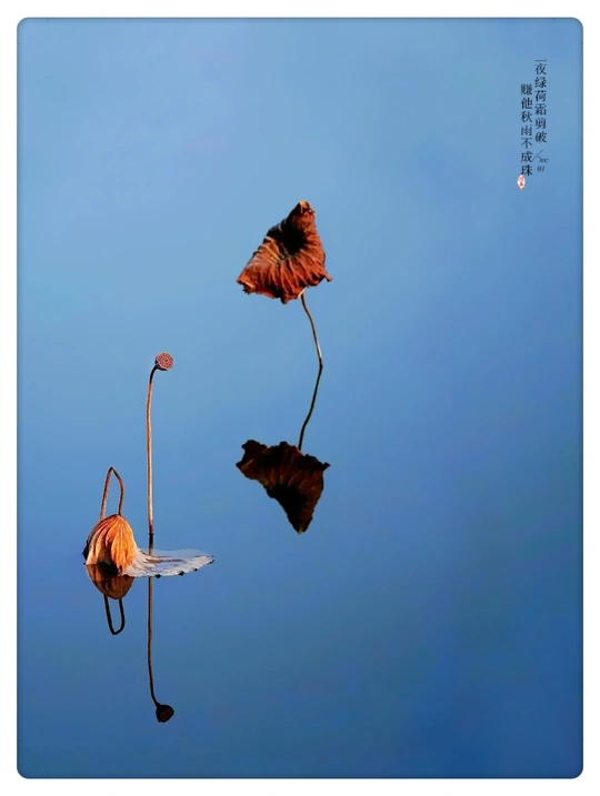 🙈作品收集 虽然已经入冬天气干冷,每次经过公园都会情不自禁去荷池看看,因为那里曾伴我度过难熬的盛夏,现在却是一片枯残的景色,在一角取的小景。 🙉作品陈述 在丝丝冰凉的塘水中,残花姿态各异,依然倔强屹立坚守着,在霞光的照耀下另样的色彩展示自己的美和存在,配上清澈蓝色的池塘水,对比性,色彩明暗简洁,一幅国画风格,跃然眼前。 🐵总结 不同的场景需要不同的审美眼光,让我们在进入每一个场景中,不急着下手咔嚓,而是先静下来,观察吸睛点,待进入意境,那就是主题点和表达。
