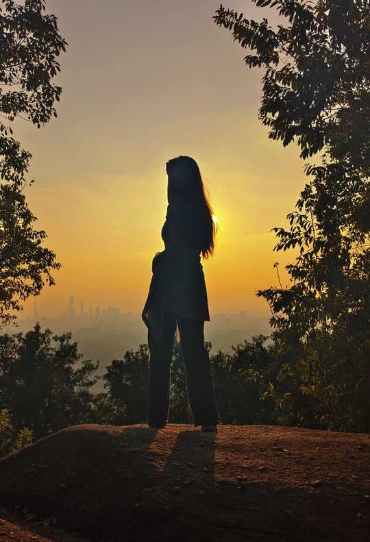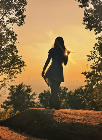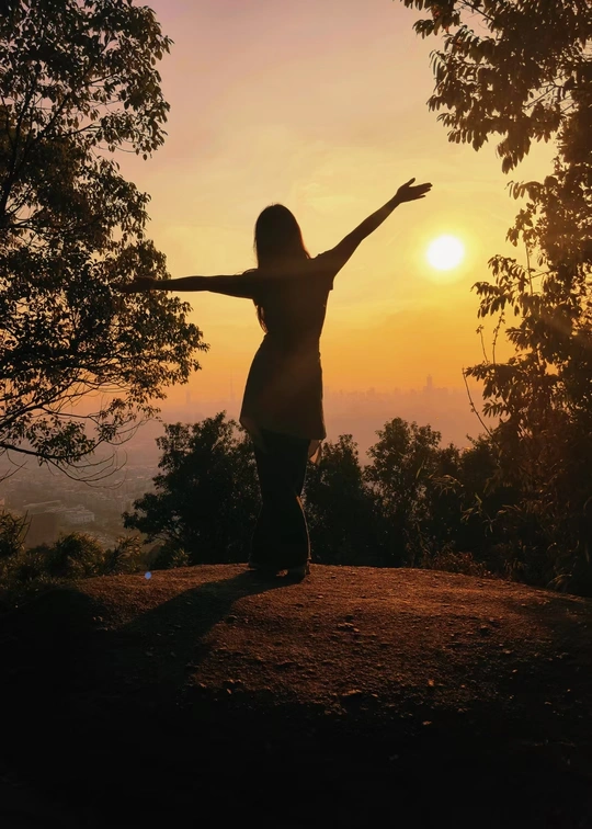 在黄昏的怀抱中,她宛如一只自由的鸟儿,张开双臂迎接落日的余晖。阳光穿过树叶,洒在她身上,勾勒出一幅宁静而美好的画面。这一瞬间,仿佛时间都为她停留,所有的烦恼都被这温暖的光芒驱散,她与自然融为一体,享受着这份独属于自己的惬意时光。