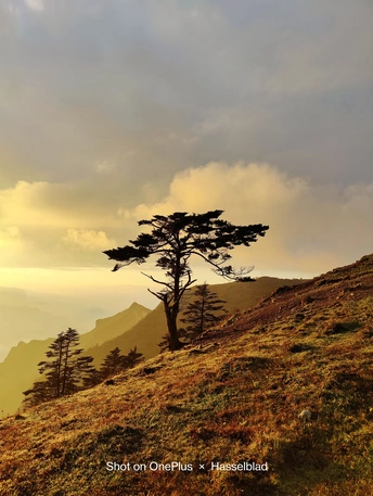 轿顶山上,阳光洒在一颗迎客松上,让这颗树充满阳光智慧。