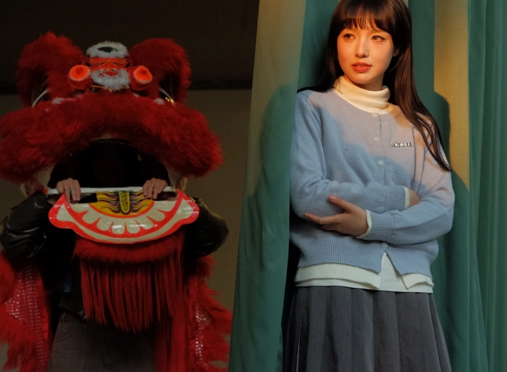 日落的余晖下,帘子背后刚好有一位舞动狮头的人。当时正在参加一个拍摄活动。所有的人都在拍模特,无意之间抓拍到模特背后的另外一幅故事。狮头的色彩和窗帘的色彩形成对比色。这是一个很好的配色。所以抓拍了一张。日落的色彩让这个画面更加的温暖。