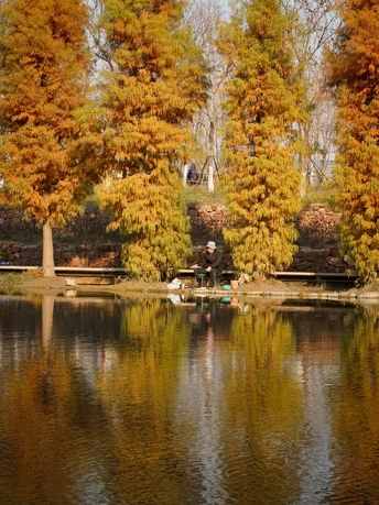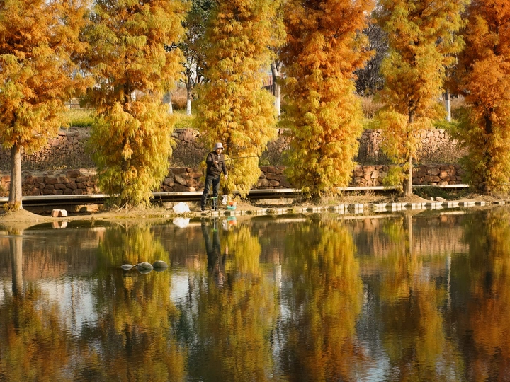 冬日的阳光懒洋洋地洒在湖面上,泛起微微的金光。岸边的树木像是被点燃了一般,金黄与橙红交织。一个孤独的身影坐在湖边,那是一位钓鱼者。他穿着厚厚的棉衣,静静地握着鱼竿,目光专注地盯着水面。周围静悄悄的,只有偶尔树叶飘落的声音。在这寒冷的冬天,他似乎在寻找一种内心的宁静,等待着鱼儿上钩的那一刻,仿佛整个世界都与他无关。