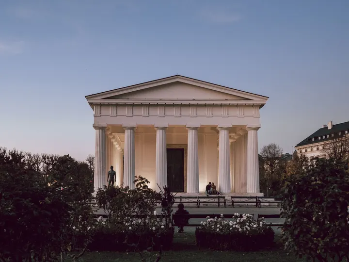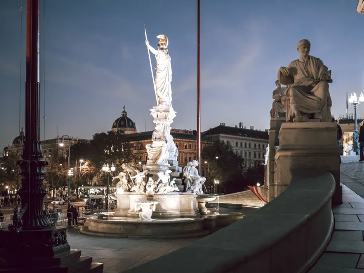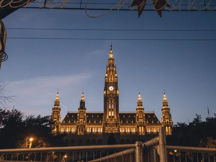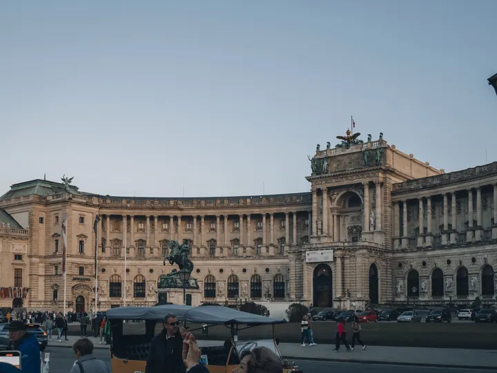漫步在维也纳特蕾西娅广场,广场上游客穿梭,或驻足交谈,或拍照留念。宏伟的教堂静静地矗立,在夕阳余晖映照下,散发着古朴而庄严的气息。 落日的金芒洒落在教堂尖顶与巴洛克式的建筑外墙上,勾勒出绝美的轮廓。随着夜幕降临,华灯初上,教堂被灯光晕染,广场也变得更加热闹。 街头艺人的表演吸引着游客围成一圈,阵阵喝彩声回荡在夜空中。璀璨灯火与古老教堂相伴,维也纳的夜,如梦如幻。
