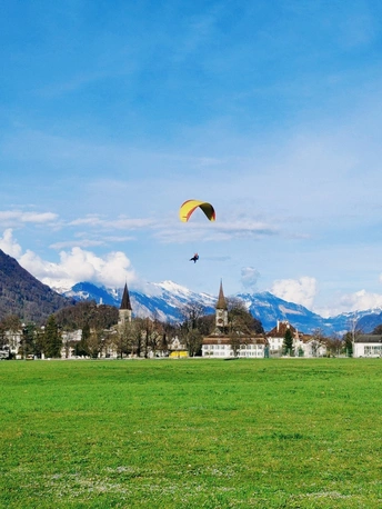 跳伞是因特拉肯传统项目,映衬雪山草坪美不胜收,让人悠然神往 ᶘ ᵒᴥᵒᶅ