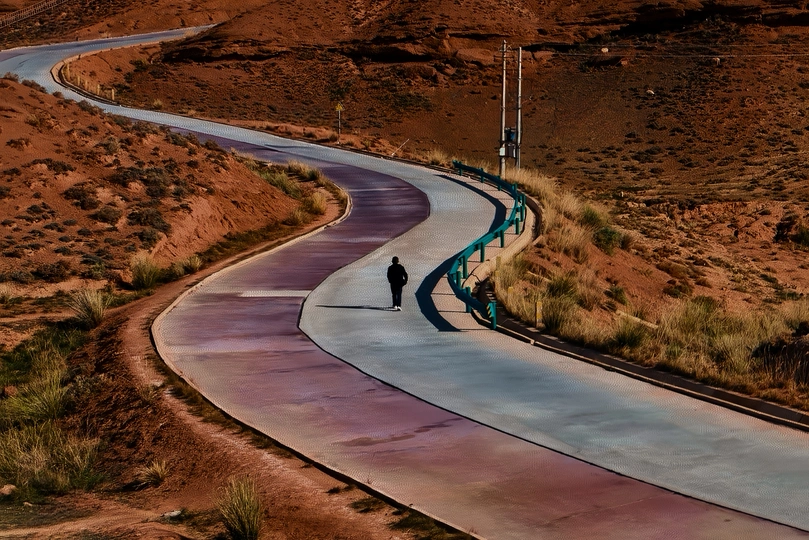在平山湖大峡谷,拍摄了公路上的一个路人,表现其故事感及电影感。