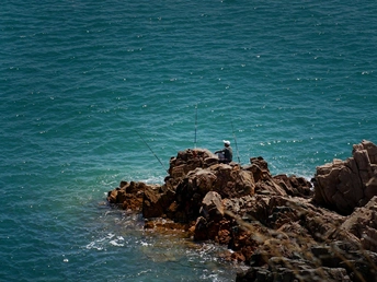 在青岛旅游时,我偶然发现了一位坐在海边礁石上钓鱼的人,他戴着白色的帽子,身旁插着几根鱼竿,背景是一片波光粼粼的大海。画面给人一种宁静、悠闲的感觉,仿佛时间在这一刻静止了。我忍不住举起相机,捕捉下这宁静而美好的瞬间。海风轻轻拂过,带来丝丝凉意。在这个喧嚣的世界里,这里就像是一处世外桃源,让我的心灵得到了片刻的宁静,这是青岛给我最难忘的礼物。