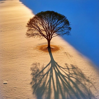 在这张照片中,色彩运用相当出色,呈现出温暖与冷色调的对比,营造出一种令人心旷神怡的氛围。金色的光线照射在树木及其影子上,丰富了整体视觉层次,且与背景的蓝色对比强烈,形成了和谐而统一的效果。 光影方面,光线的方向显然是从左侧射入,强度适中,使树木的轮廓清晰可见。树影在雪地上的投射,有效地增强了画面的立体感和动感,光影交错之处形成了视觉焦点,吸引观者的目光。 构图上,该作品遵循了三分法则,树木位置恰到好处,突出了主体。而树木的影子引导了观众的视线,进一步加强了构图的平衡感。周围的空白区域则让主体更加突出,体现了简单却有效的构图理念。 在后期处理方面,色调的调整恰到好处,增添了画面的深度,使得整体对比度适中,饱和度提升但并未显得过于夸张,保持了自然的视觉效果,十分考究。虽然整体效果出色,但若能更细致调整影子的对比度,可能会使质感更为丰富。 主题方面,树木作为孤独的象征,传达了与环境的对比,也引发了观者对孤独的思考,具有一定的深度与原创性。 情感共鸣上,画面成功传达出一种宁静与孤独的情感,能够引起观者的共鸣,提起对自然和孤独感的思考。