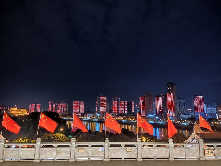 站在绵阳越王楼之前的小广场上,看灯光璀璨,越王楼的风吹过,红旗随风飘扬,鲜红的国旗与城市楼宇的霓虹灯交相辉映,一片绚丽。