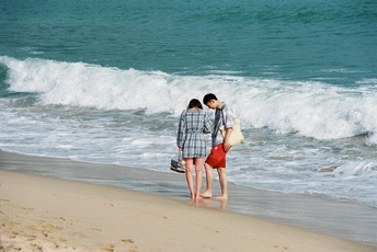 西涌沙滩上,一对情侣在海边踩水,夕阳的光影照在人物身上,形成了一个富有电影感的画面。