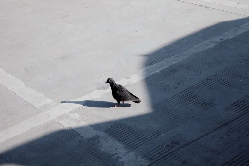 正午的阳光将建筑投影在地上,一只鸽子恰好停留在收缩的光影里,和谐又有趣。