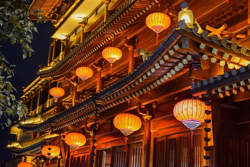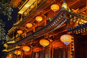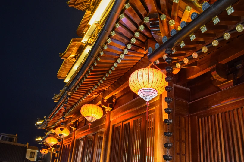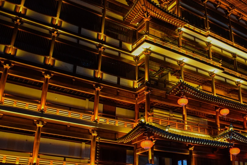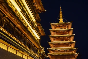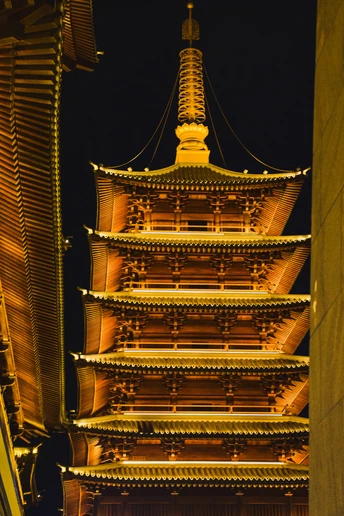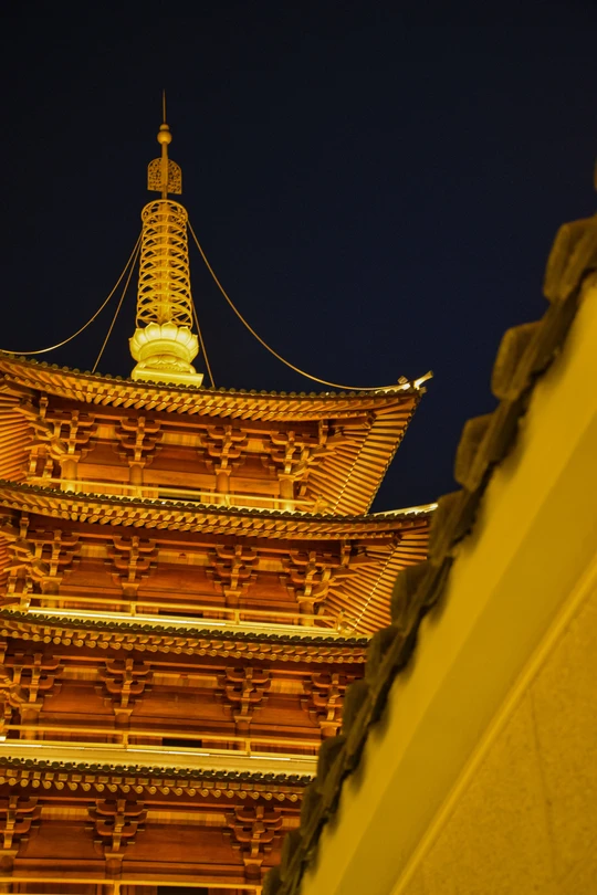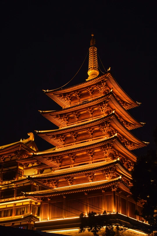 夜幕低垂,橙红宝塔独璀璨。檐角飞翘,脊兽守望,历史低语于灯火阑珊。