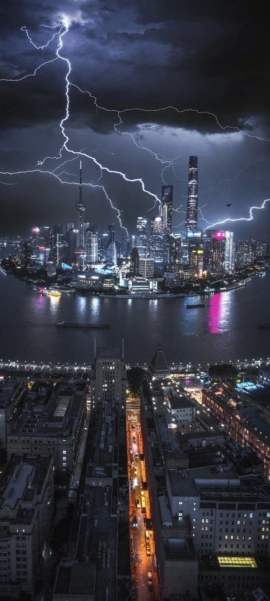 夜晚魔都的闪电让上海宛如一座罪恶都市