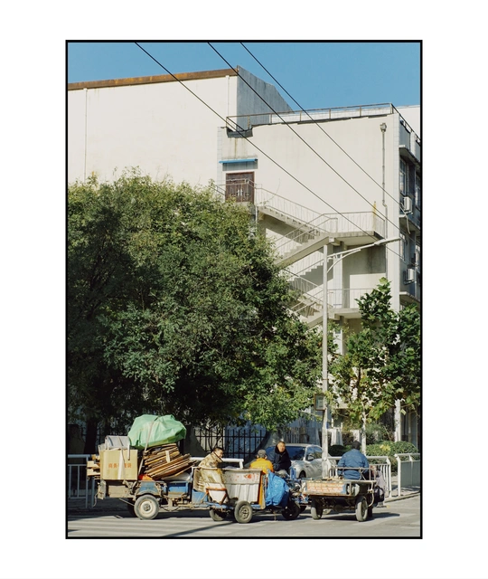 三轮车和忙碌的人们,仿佛在诉说着生活的艰辛与奋斗。背景中的绿树和建筑,给人一种宁静的感觉。这里没有喧嚣,只有朴实的人们在为生活奔波,简单却充满力量。