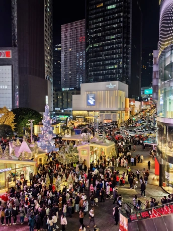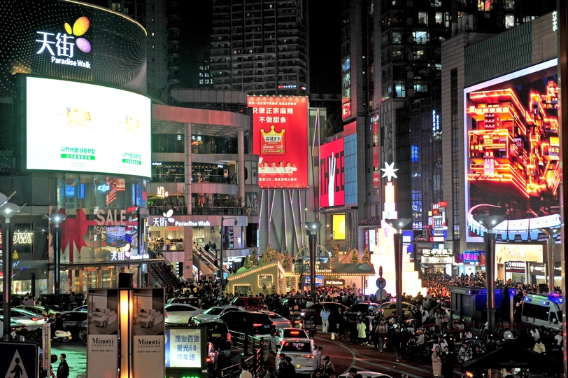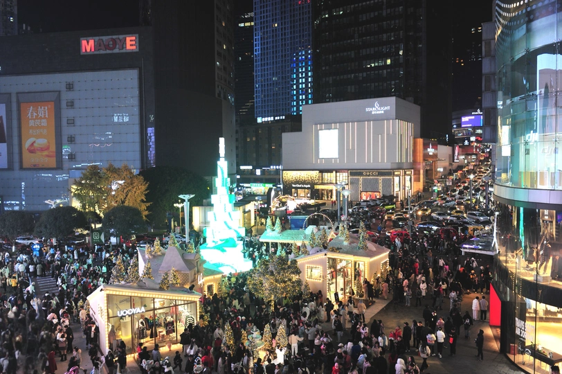 观音桥夜晚商业中心人声鼎沸,人们川流不息,忙着购买年货,忙着在2024年将家人的留影存在自己的相册中。