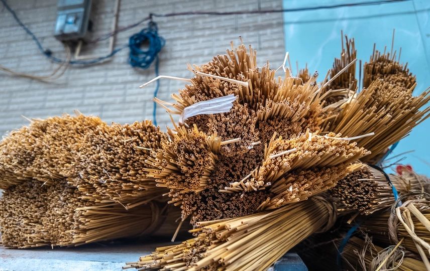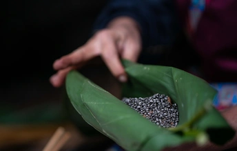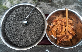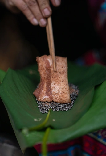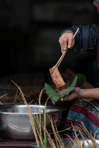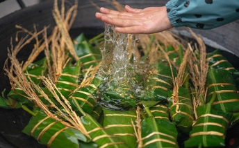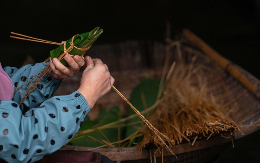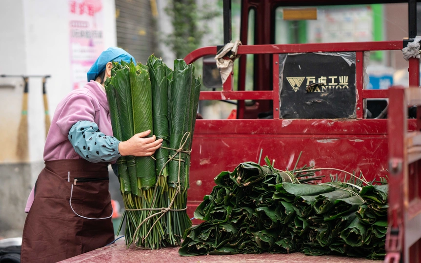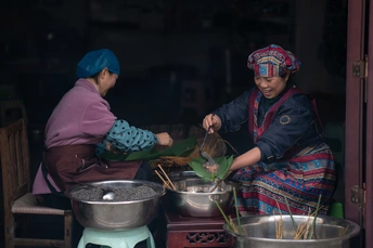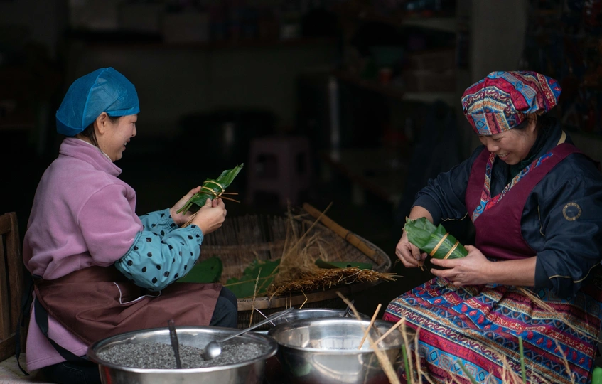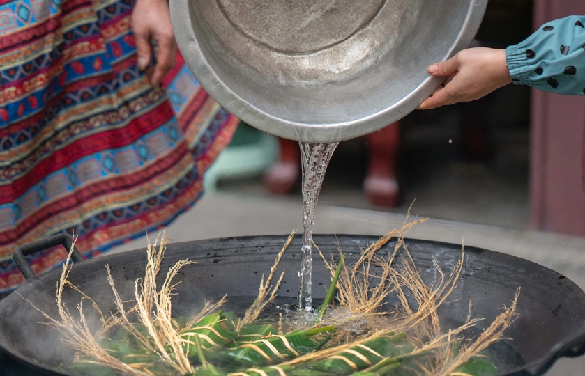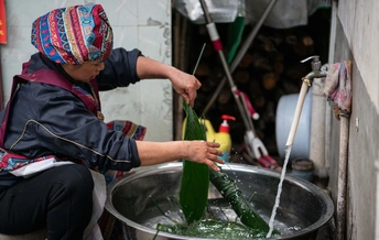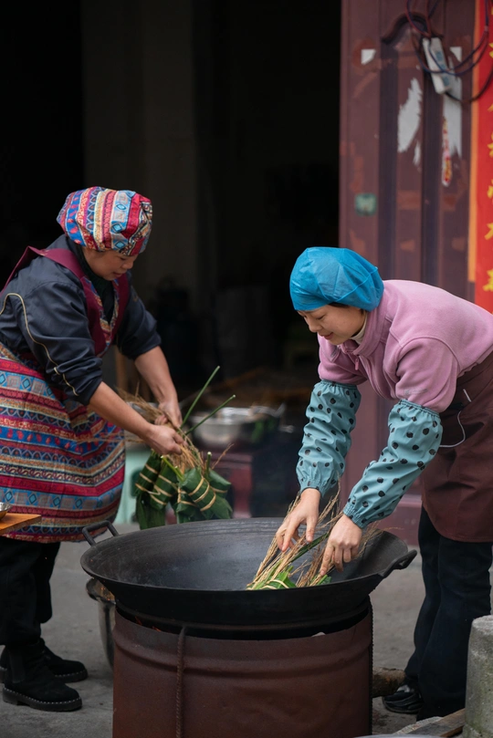 2024年12月14日,贵州省黔西南布依族苗族自治州望谟县蟠桃街道,农妇韦丽芬邀约姐妹一起制作布依族传统美食——枕头粑。 枕头粑是布依族最常见的年货,也是独具地方特色的传统美食,因形如枕头而得名。布依语叫“豪房”。枕头粑是逢年过节布依族群众必须用最虔诚的心意,最复杂的工序,耗费时间最长来制作。枕头粑以高山高杆糯米为主要原料,配以饭豆,肉片,猪油,八角,草果,食盐等香料,用粽粑叶(属竹芋科的柊叶,具有能够产生特别香味、又具有解毒清热功效)包装,稻谷穗杆包扎而成。 枕头粑包好以后架起大锅,从早上开始煮要持续12个小时,大锅里煮沸的水冒着白气,伴着哔哔咘咘的声音,整个过程中要翻三回才能受热均匀。打开煮熟的枕头粑,味道清香,酥软可口,尤其是连叶烤熟,米香,肉香,稻香、叶香,一起扑鼻而来,浸人心脾,油煎烧烤味道更佳。