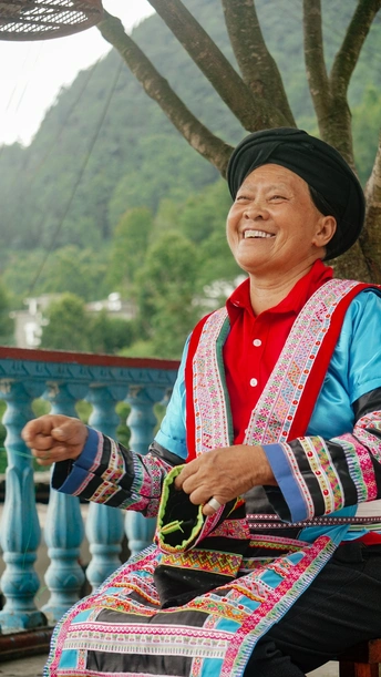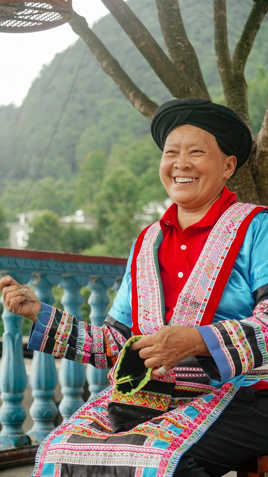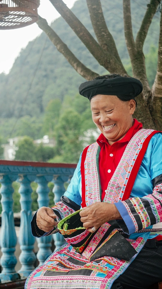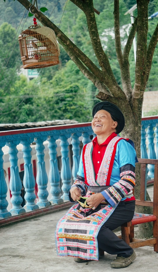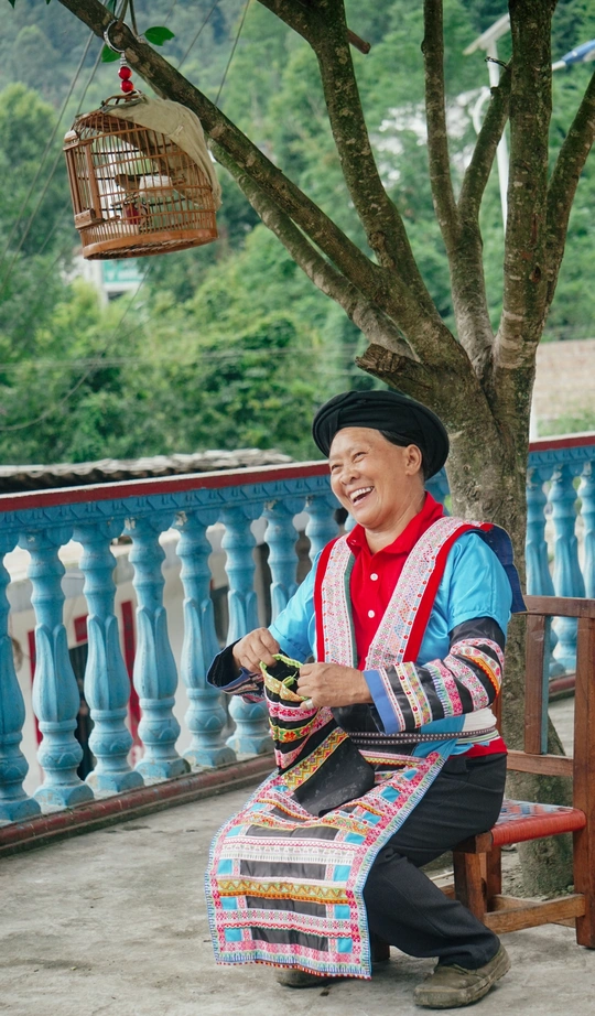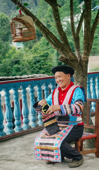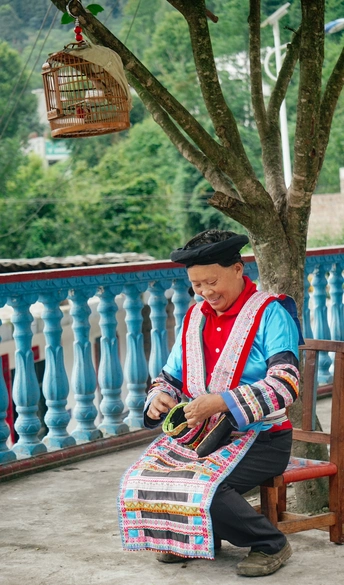 2021年8月18日,贵州省黔西南布依族苗族自治州望谟县乐旺镇交俄村,农家小院,一位苗族老人(白苗,望谟县苗族一个分支)在家门口的树下做手工刺绣。老人头上是一个鸟笼,脚下有一只小狗在陪伴。