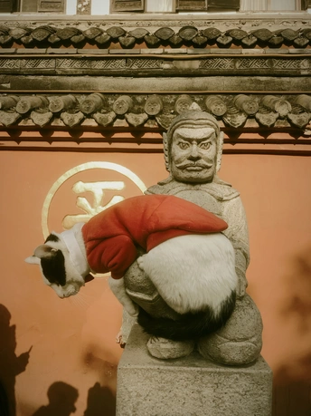 成都文殊院的秋季,吸引了众多游客前往游览,网红打卡地红墙,聚集了无数美女拍照,一只坐在石像怀里的喵星人也抢尽了风头。