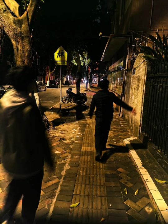 夜街静谧,昏黄灯光洒落,映着飘零残叶与行人身影。路旁机车静卧,远处车灯明灭,似述夜事。街角黄牌警示,两旁楼阁于暗夜默立。此街如长卷,夜幕垂落,故事悄生,行人匆匆,或愁或喜,皆为夜街之墨绘就无名之诗。