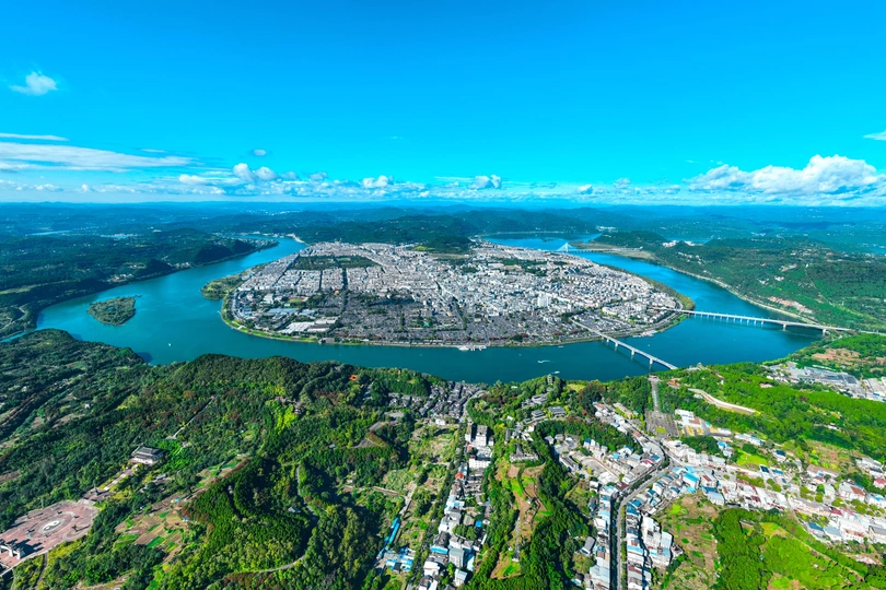 鸟瞰阆中古城,嘉陵江如一条蜿蜒的玉带轻柔地环抱着古城。山水城相依相融,勾勒出一幅天然的太极图。