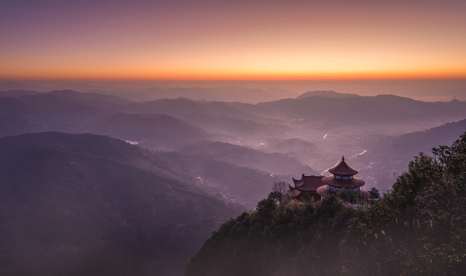 一座寺庙静静地矗立在山巅,迎接着晨光的洗礼。远处的山脉在晨雾中若隐若现,天空由深蓝渐变为温暖的橙黄,预示着新一天的开始。这张照片捕捉了自然与人文的和谐共存,展现了东方建筑与自然景观的完美融合。