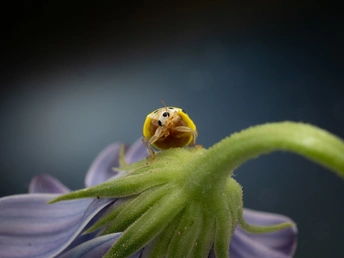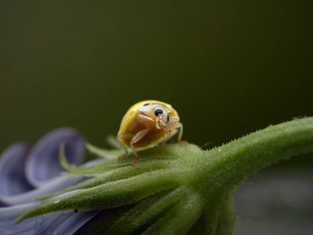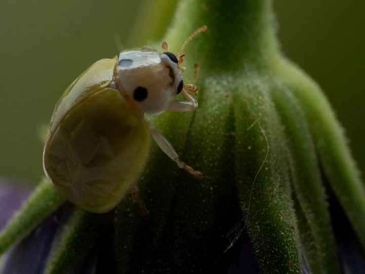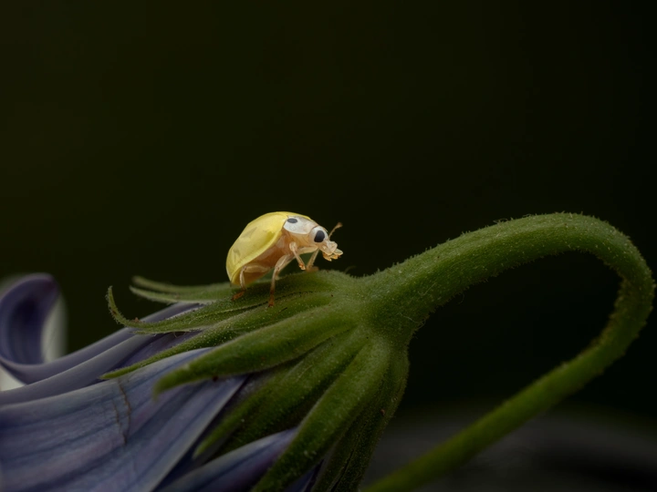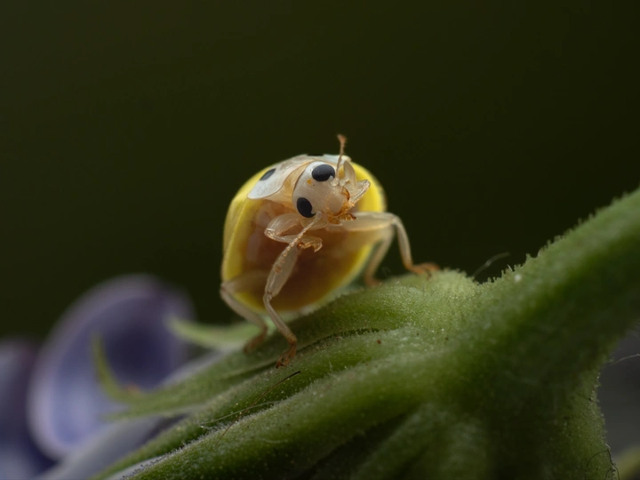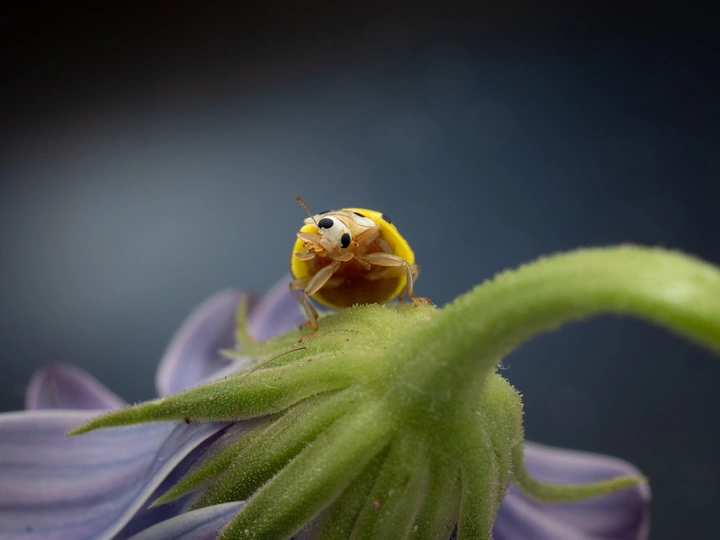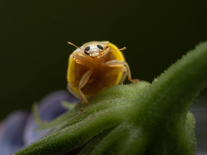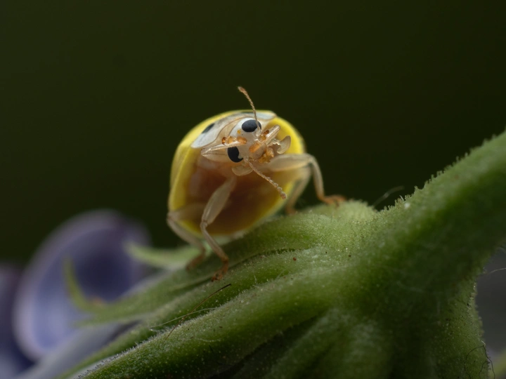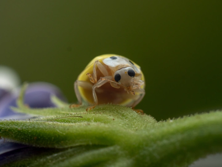 一只瓢虫停在绿叶上,黄色的壳上点缀着黑色的斑点,就像穿着一件漂亮的外衣。它小小的触角微微摆动,黑亮的眼睛好奇地张望,仿佛在探索这个奇妙的世界。它那可爱的模样如同大自然的精灵,为这绿色的世界增添了一抹俏皮的色彩。瓢虫虽小,却在自己的天地里悠然自得,给我们带来了一份简单而纯粹的快乐。