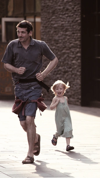 温馨与活力扑面而来。阳光倾洒地面,温暖满溢。奔跑中,爸爸步伐稳健,女儿欢快兴奋,脸上的笑容如阳光般灿烂。石墙和建筑物静静矗立作背景,宁静与活力对比鲜明,却又无比和谐,感染力十足,让人看了心生美好与向往。