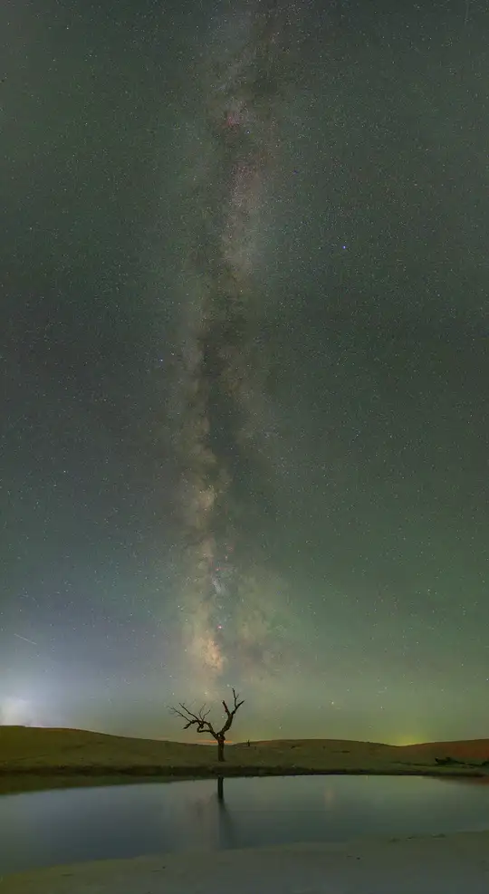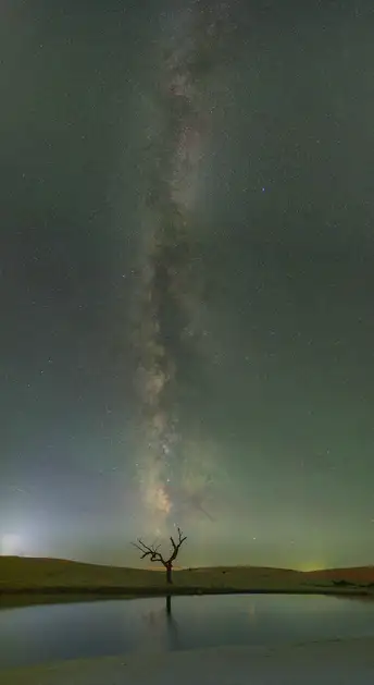 奈曼旗宝古图沙漠地绿色大气气辉,竖接银河。 9月的星空虽然已经冷了,但依然拍摄到不错的作品 沙漠,小河,气辉,银河 .