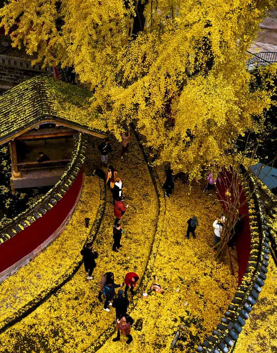 北碚宝轮寺的银杏树,被誉为“北碚之宝”。每当秋季来临,宝轮寺的银杏树便成为了人们眼中的焦点。其树冠高耸,枝繁叶茂,金黄色的银杏叶在阳光的照耀下,显得格外耀眼。 这棵银杏树历史悠久,见证了宝轮寺的沧桑变迁。它的存在不仅为宝轮寺增添了一抹亮丽的色彩,更成为了北碚区的一大景观。每到深秋时节,金黄的银杏叶纷纷扬扬地飘落,为整个寺庙披上了一层金色的外衣。漫步在银杏树下,仿佛置身于一片金色的海洋中,让人心旷神怡。