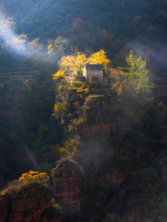 秋日古石屋,金叶环绕映阳光。山峦叠翠添静谧,自然之美入画来。