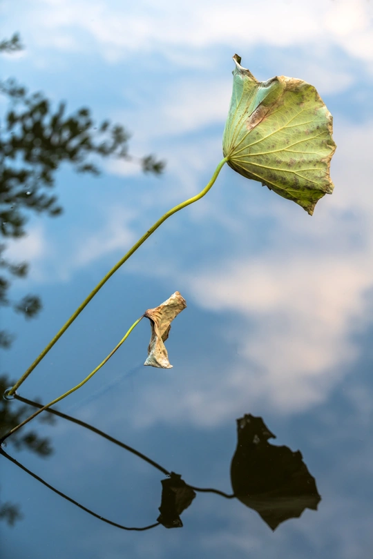 成都初冬的下午,天气放晴,蓝天白云倒映在荷塘里,与两只残荷相映成趣,尽显冬季画风。