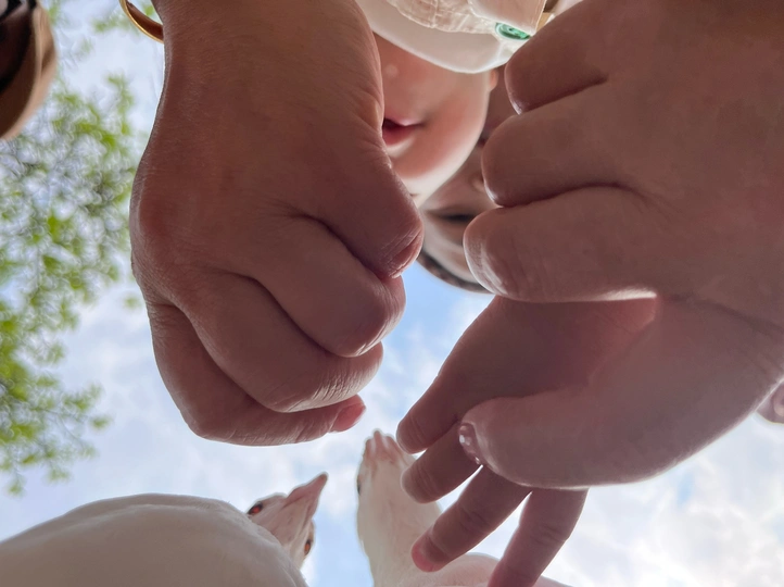 大人和孩子的相互陪伴,大手牵着小手,在公园里喂鸽子。