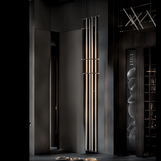 这张照片呈现了一个现代室内空间,其特点是强烈的直线感和单色调。下面是对其七个方面的详细评价和改进建议: **色彩**:照片主要采用单色调,以深灰色和黑色为主,搭配暖白色的灯光。整体色彩和谐统一,营造出一种现代、简约的氛围。暖色调的灯光与冷色调的背景形成对比,突出了灯具的形态。但是,色彩的单一性限制了情感表达的丰富度。建议尝试加入一些微妙的色彩变化,例如通过后期调整增加微妙的蓝色或绿色调,来增加视觉层次。 **光影**:光线主要来源于照片中的灯具,形成明显的垂直光线,在深色背景上产生强烈的对比。这种光影效果有效地突出了灯具的几何形态,并营造出一种戏剧性的氛围。然而,光线略显生硬,缺乏柔和过渡,这使得画面略显单调。建议使用柔光罩或者采用漫射光源,使光线更加柔和,从而增加画面的层次感和氛围感。 **构图**:画面采用对称构图,将灯具置于中心位置,并通过深色墙壁形成框景。这种构图方式使得主体非常突出,但同时也显得略微呆板。主体过于居中,缺乏视觉引导,容易使画面显得过于平衡而缺乏动感。建议尝试使用三分法构图或者对角线构图,将主体稍微偏离中心,增加画面的趣味性和引导性,使视觉焦点更具吸引力.