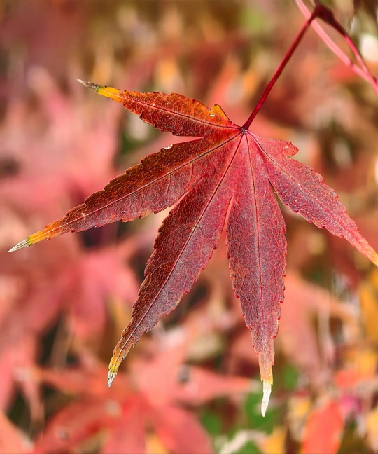这张照片展现了一片红叶的特写,整体表现良好,但仍有提升空间。以下是对各个方面的详细评价: **色彩:** 红叶的色彩鲜艳,主色调为红色,并带有黄色和棕色的过渡,色彩过渡自然。背景的色彩也以红色为主,但略显模糊,整体色彩较为和谐,营造了秋季的氛围。然而,背景颜色过于相似,略微缺乏层次感。可以考虑通过更精准的色彩控制或角度调整,在保留秋季氛围的同时,让主体更加突出。 **光影:** 光线比较均匀,属于柔和的光线,可能是阴天或者漫射光环境。这使得叶片的细节得到了较为清晰的展现,但缺乏戏剧性的光影效果,略显平淡。如果能利用侧光或逆光,可能会产生更具立体感和质感的画面。叶片上有一些细微的反光,增加了质感,但整体的光影效果仍有提升空间。 **构图:** 构图采用中心式构图,红叶位于画面中心,这种构图方式较为稳妥,主体突出,简洁明了。但是,叶片整体过于居中,周围留白空间略显不足,画面略显拥挤。建议可以尝试采用三分法构图,将主体稍微移向一边,让画面更加生动,也增加视觉的引导性。 **后期处理:** 从照片来看,后期处理比较克制,没有过度修饰的痕迹。色彩饱和度适中,对比度也比较自然。