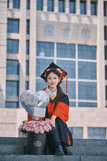 这张照片整体表现良好,是一张合格的毕业照。下面我将从色彩、光影、构图、后期处理、主题原创性、情感共鸣和思想深度七个方面进行详细评价和改进建议。 **色彩:**照片的色彩搭配以红色、黑色、浅粉色和灰色为主。红色和黑色的学位服与背景的灰色调形成了对比,使主体较为突出。粉色的玫瑰花束增添了柔和感。整体色彩搭配虽不惊艳,但较为和谐。然而,背景建筑的浅灰色略显平淡,稍弱化了画面的活力。改进方向:可以尝试通过调整白平衡或后期处理,使背景色更具层次感,或者选择色彩更鲜明的背景。 **光影:**光线较为柔和,属于均匀的漫射光,没有明显的阴影,这使得人物面部光线均匀,细节清晰。但这种光线也缺乏立体感,使得画面略显平淡。主体面部没有高光和阴影的对比,缺乏一定的表现力。改进方向:可以考虑在拍摄时利用早晚的斜射光,制造一些阴影和高光,增加照片的戏剧性,或者使用反光板等辅助工具来调整光线,使人物面部更具立体感。 **构图:**采用中心构图,人物位于画面中心,较为稳定。但过于中心的构图略显呆板,缺乏动感。人物头顶上方留白较多,显得有些空旷,可以稍微下移人物的位置。玫瑰花束和气球等元素围绕人物,起到了衬托作用