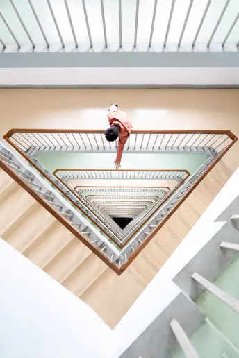 在上海拍到的一座独特的螺旋楼梯,楼梯的设计非常几何化,呈现出一种三角形的形状,形成一种重复的视觉效果,不仅仅是线条,楼梯的配色我也很喜欢。