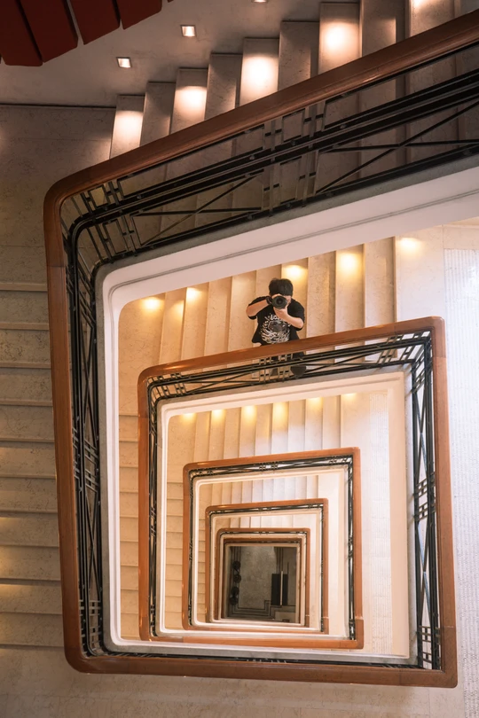 从上往下看的时候,层层叠叠的台阶和栏杆逐渐似乎逐渐缩小了,仿佛延伸到无穷的远处。
