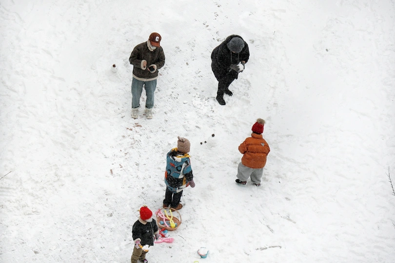 院子里下了厚厚一层雪,邻居们都出去观雪景,孩子们也开心的玩着雪团,堆起各种小雪人