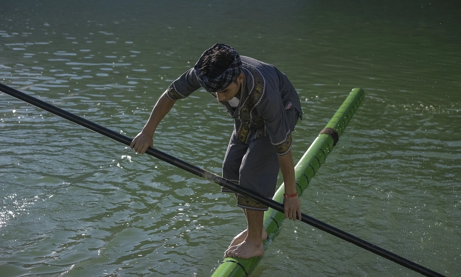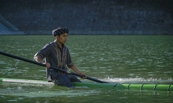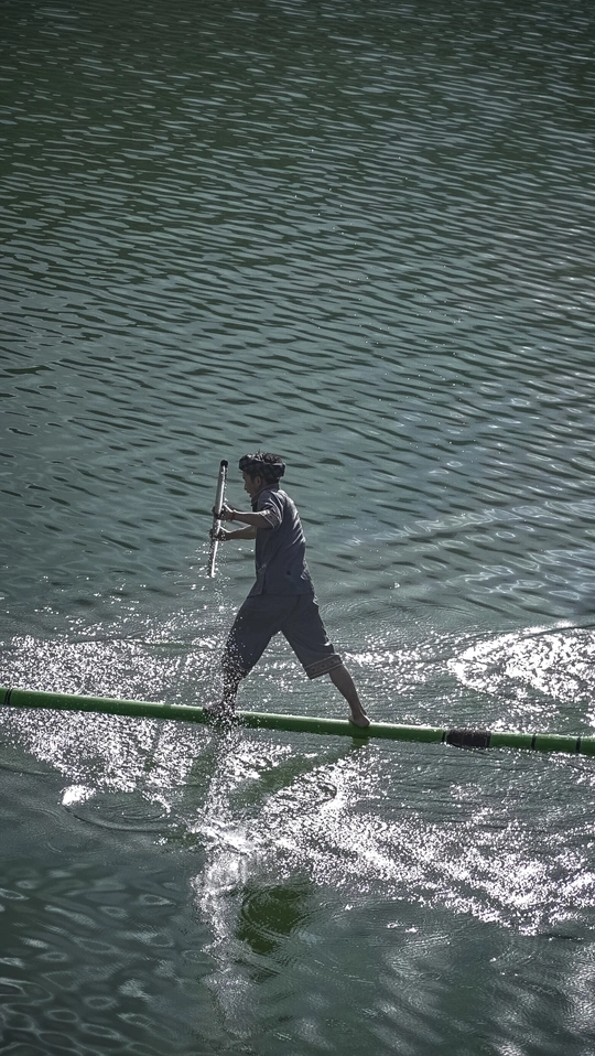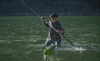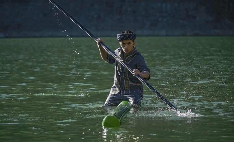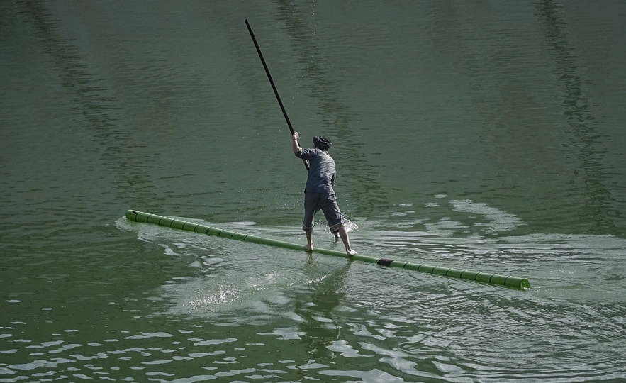 2018年7月15日,贵州省黔西南布依族苗族自治州望谟县新屯街道新屯村,布依族男子在水面上练习独木漂技艺。