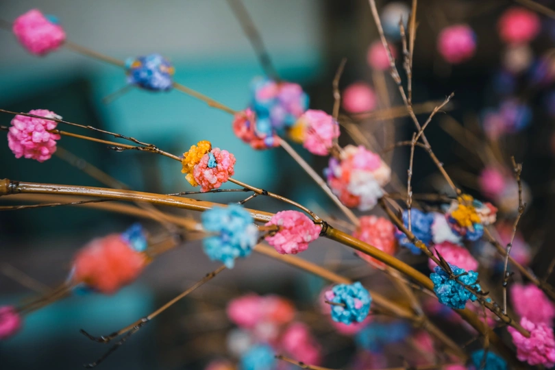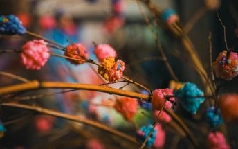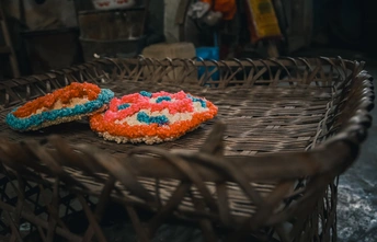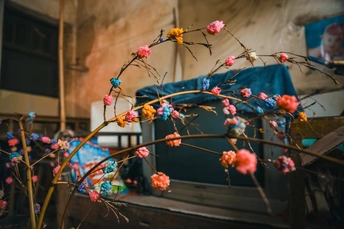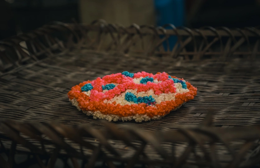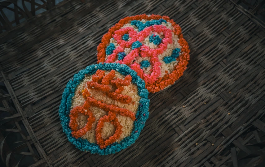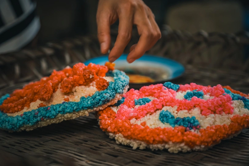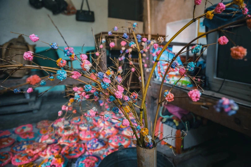 2015年4月25日,贵州省黔西南布依族苗族自治州望谟县桑郎镇桑郎村,农户家中制作好的米花。米花是布依族传统的小吃,稻米经过油炸膨胀,然后用糖水和指甲花、密蒙花等天然染色,制作成各种形状。米花也是布依族婚庆必送的礼物之一。