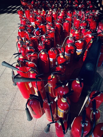 一堆过期的灭火器在阳光下,像是一群娃娃站在操场上晒太阳,喷嘴像是那些吵闹的娃娃在叽叽喳喳,当然还有一些在安静的站着