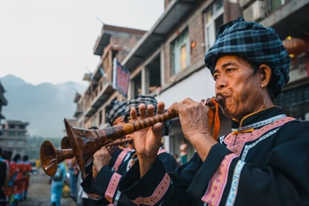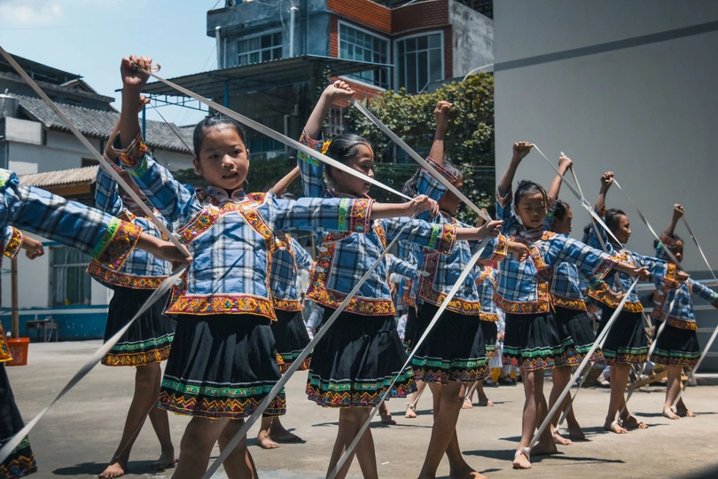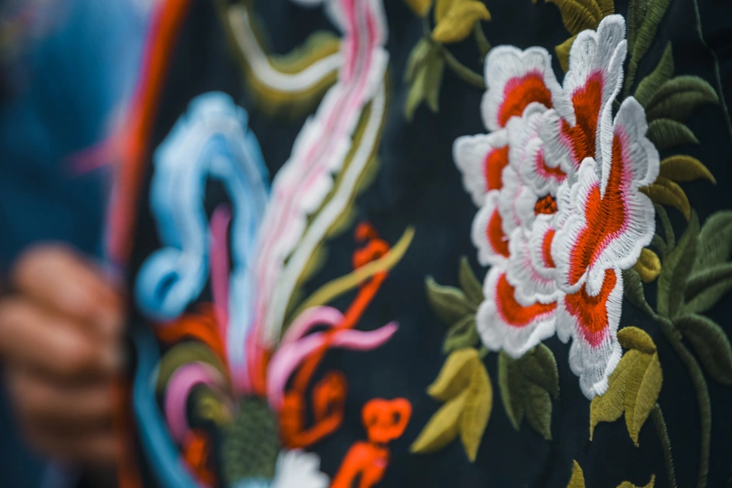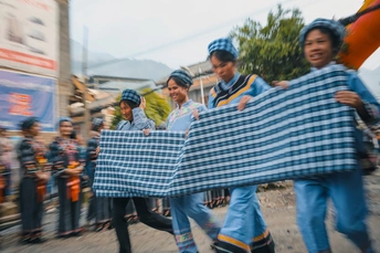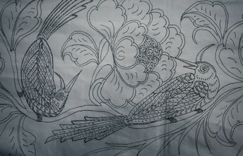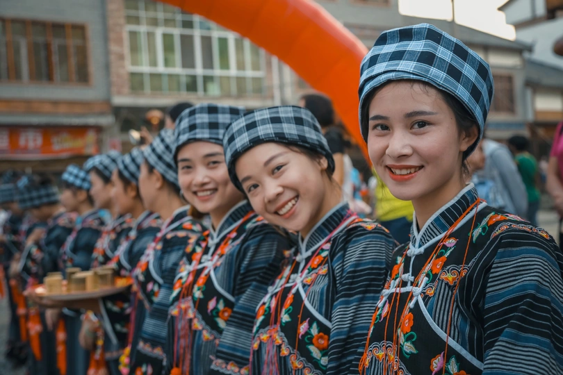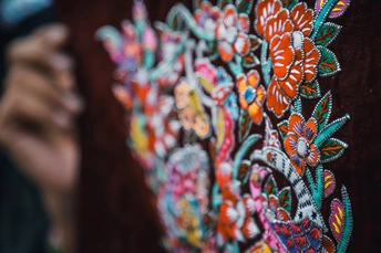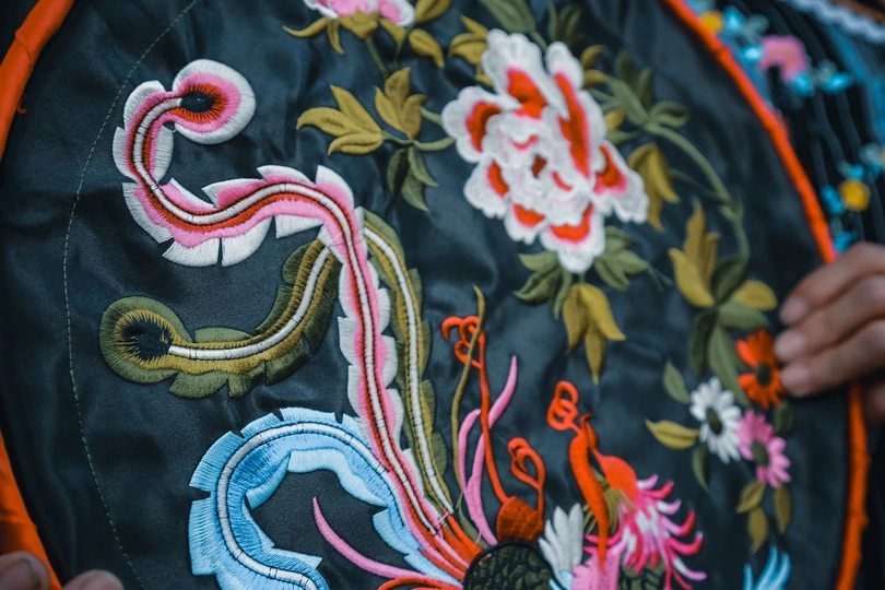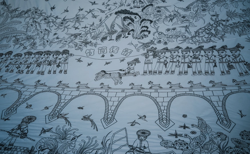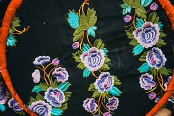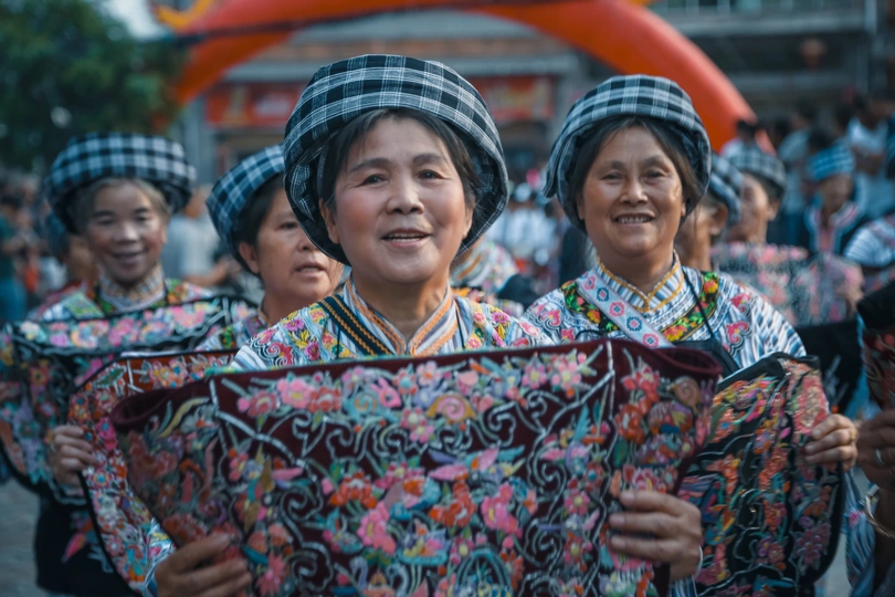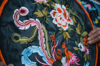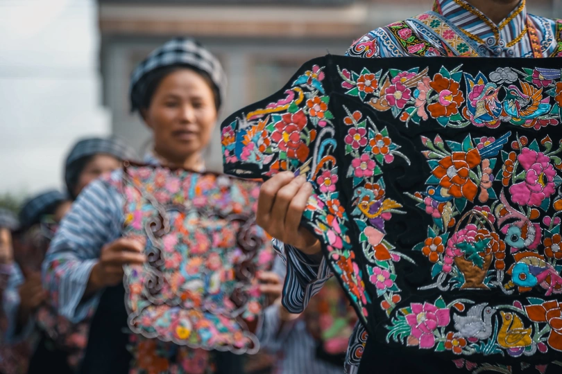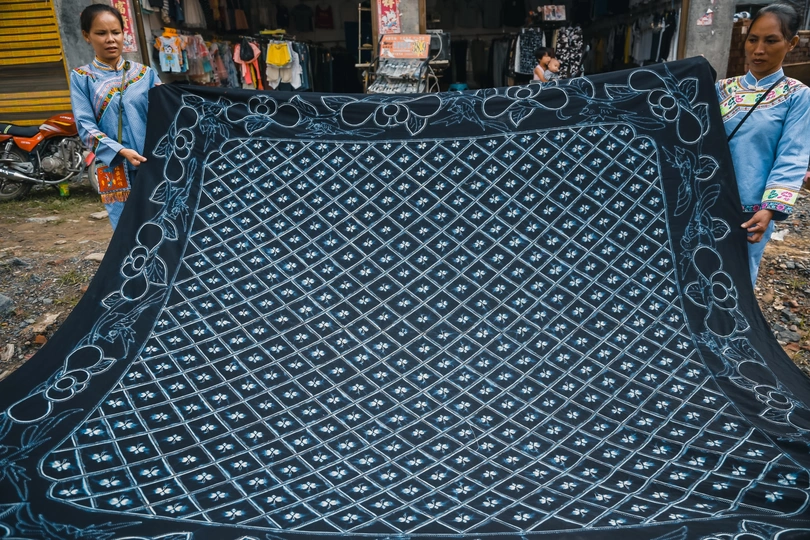 2015年4月27日,贵州省黔西南布依族苗族自治州望谟县桑郎镇桑郎村,这里是远近闻名的“布依刺绣之乡”,布依族绣娘在展示色彩绚丽、纹饰精美的手工绣作品。
