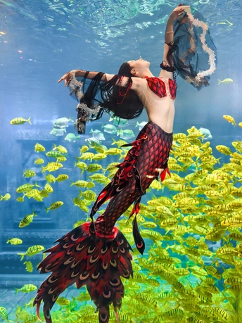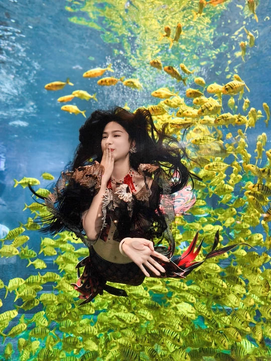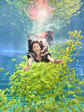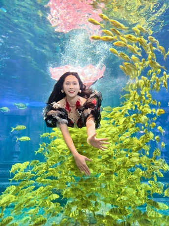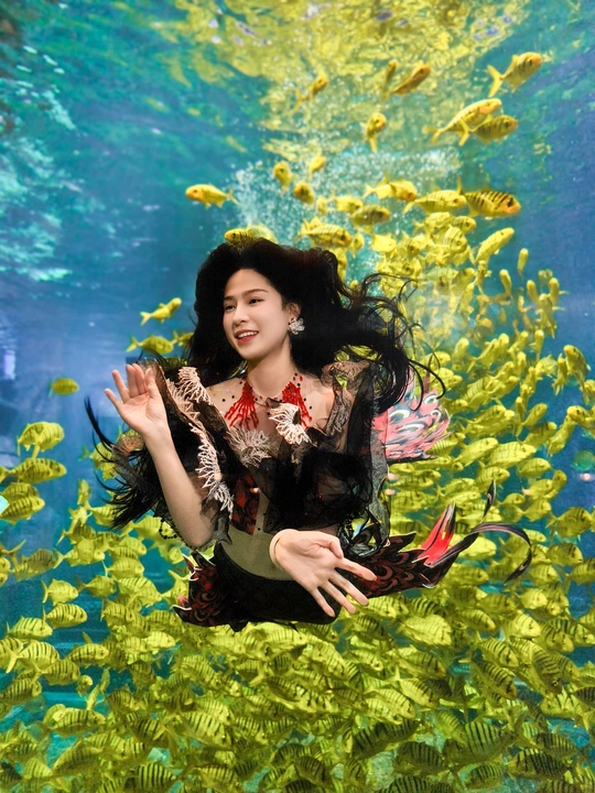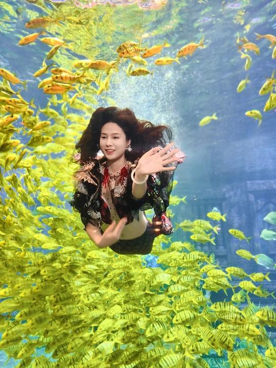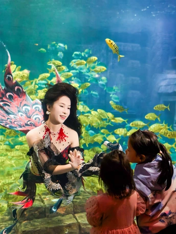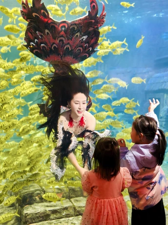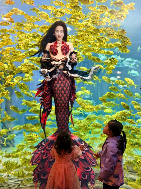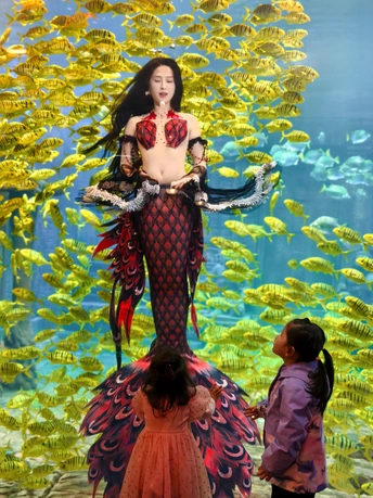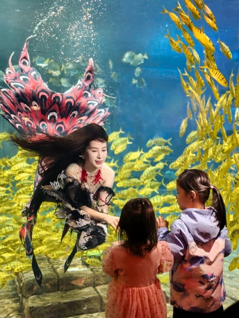 在海底世界遇见了美丽的美人鱼,周围游动着成群的黄色鱼类。两位小女孩站在美人鱼面前,仰望着她,显得非常兴奋和好奇。 拍摄:vivox200pro