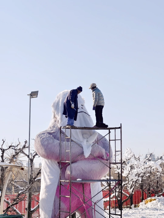 两个工人正在为巨大的猩猩玩偶装饰,大猩猩一副不满意的表情看着二人,不知道是二人在交涉还是人和动物在交涉。