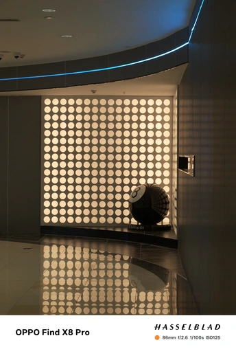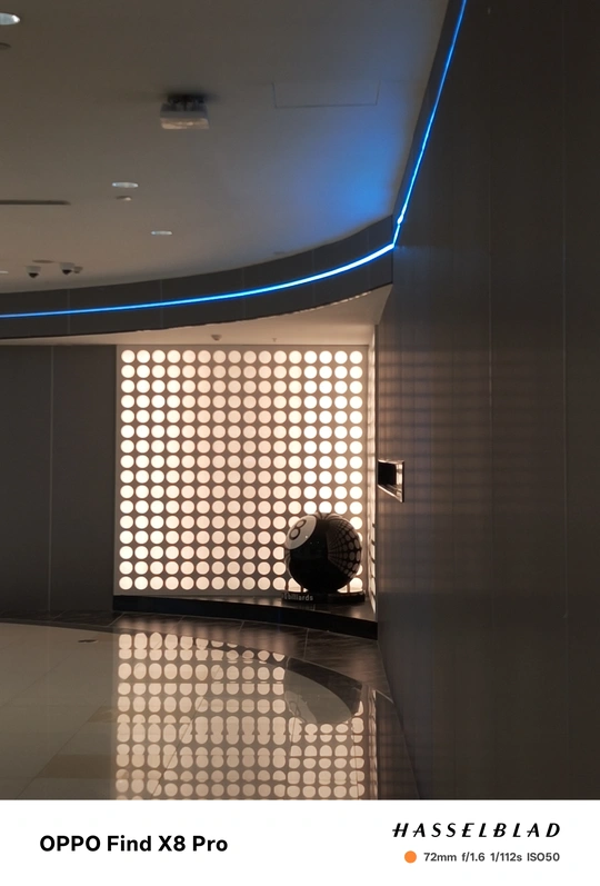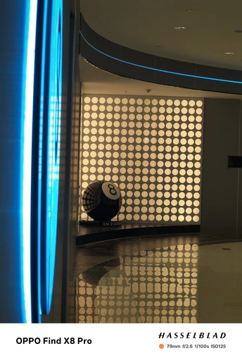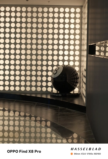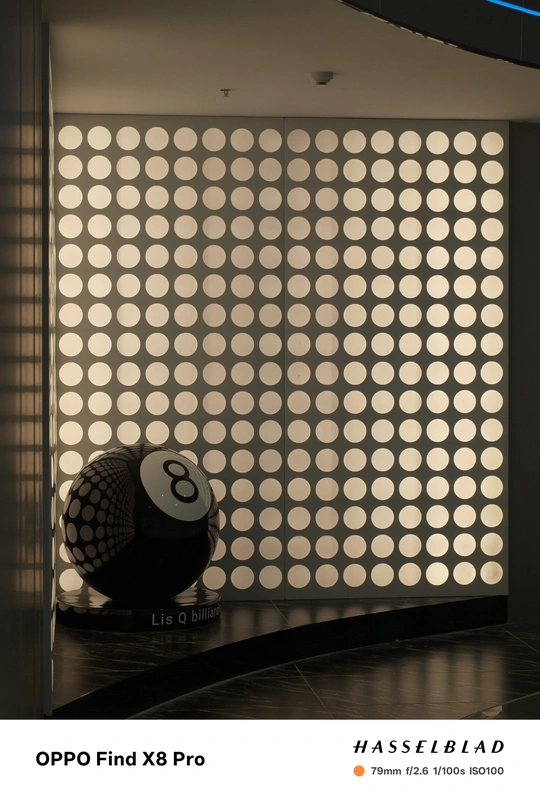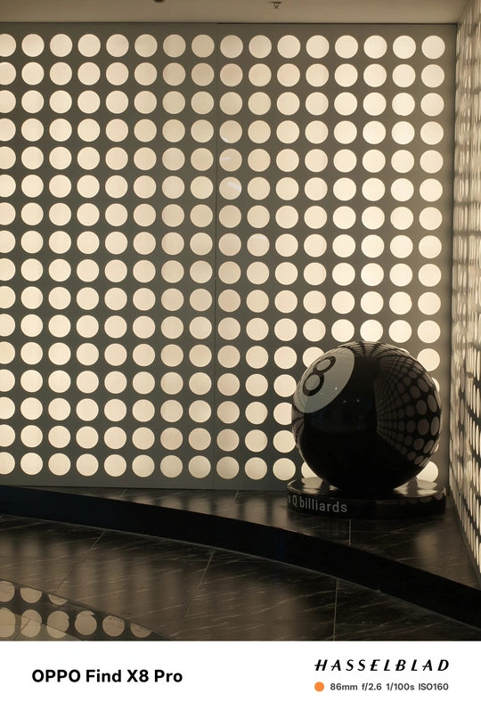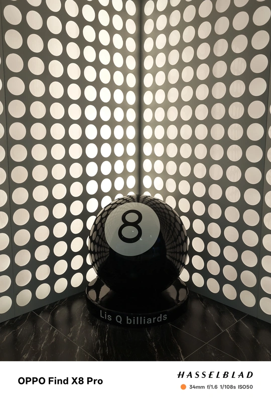 这张照片在色彩方面呈现了冷暖对比,蓝色霓虹灯与暖黄色的墙面形成了反差,但整体色调略显平淡,缺乏更深层次的色彩情感表达,色彩的饱和度也不足。光影方面,主要依赖室内人造光源,光线较为均匀,没有形成明显的明暗对比,缺乏戏剧性的光影效果。特别是墙面部分的均匀照明导致主体球体部分显得平淡。构图上,采用了较为常规的中心构图,八号球主体略偏右下,并被左侧的蓝色霓虹灯柱遮挡了部分视线,主体不够突出,没有有效的利用三分法或黄金分割等构图原则。后期处理方面,从整体效果来看,似乎没有经过过多的调整,因此较为真实,但也显得不够精致,可以适度提高对比度和饱和度,特别是对高光和阴影部分进行微调…
