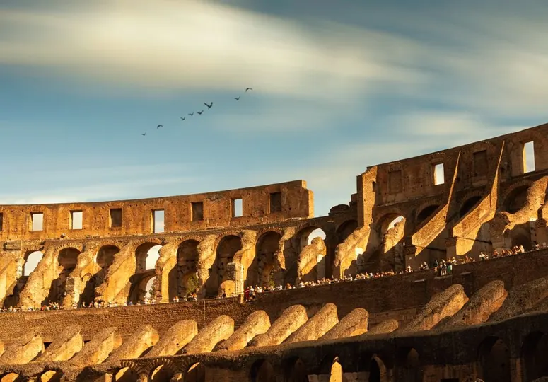 当夕阳的暖光倾洒在罗马斗兽场的残垣断壁上,历史的厚重与岁月的温柔交织出一场绝美的邂逅。石块的轮廓被余晖勾勒,明暗错落,仿佛每一道缝隙都在诉说着往昔的喧嚣与辉煌。那金黄的色调,宛如液态的黄金缓缓流淌,为这座古老的竞技场披上了一层梦幻的薄纱。时光在这里仿若凝固,又似在光影的变幻中加速回溯,让人不禁沉醉于这跨越千年的壮丽景致之中,于无声处聆听历史的深沉回响。
