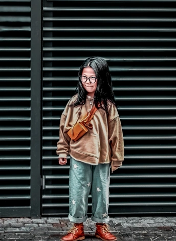 她的穿着打扮别具一格,散发出独特的魅力,她的眼神里透露出无限的坚定和勇气,真是酷毙了。