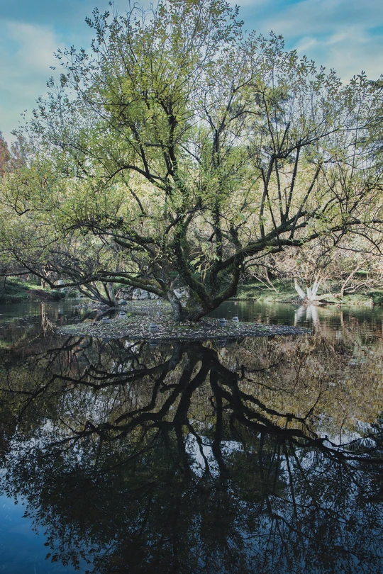 一棵枝繁叶茂的大树,矗立在平静的水域中央。水面如镜,清晰地倒映出大树的模样,形成完美对称。