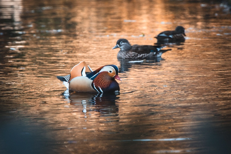图中展现了一幅宁静的水面景象。水面上有三只鸳鸯在游动,最前方的一只羽毛色彩鲜艳,头部红、白、黑相间,身体橙白交错,翅膀有黑白条纹,在阳光下熠熠生辉。后方两只羽毛呈深棕和灰色,整个场景祥和而静谧。