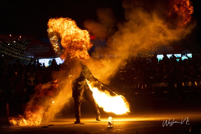 表演者用火刀展示出一条神似蛇一般的火焰,2025蛇年,红红火火。