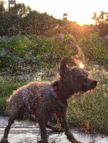家有毛孩子的都知道,夏日玩水,是它们最喜欢的娱乐之一! 落日下抓拍到甩水的一瞬间,水在阳光的照射下很美
