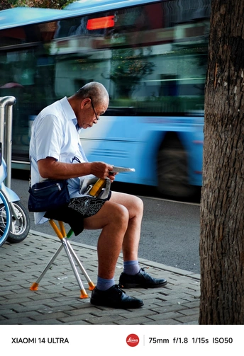 老人静坐在街边,专注翻阅报纸,车水马龙间自成一派宁静。